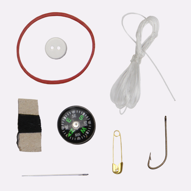 Survival Kit – Mini fire starter, fishing line/hooks, signal mirror, and more.